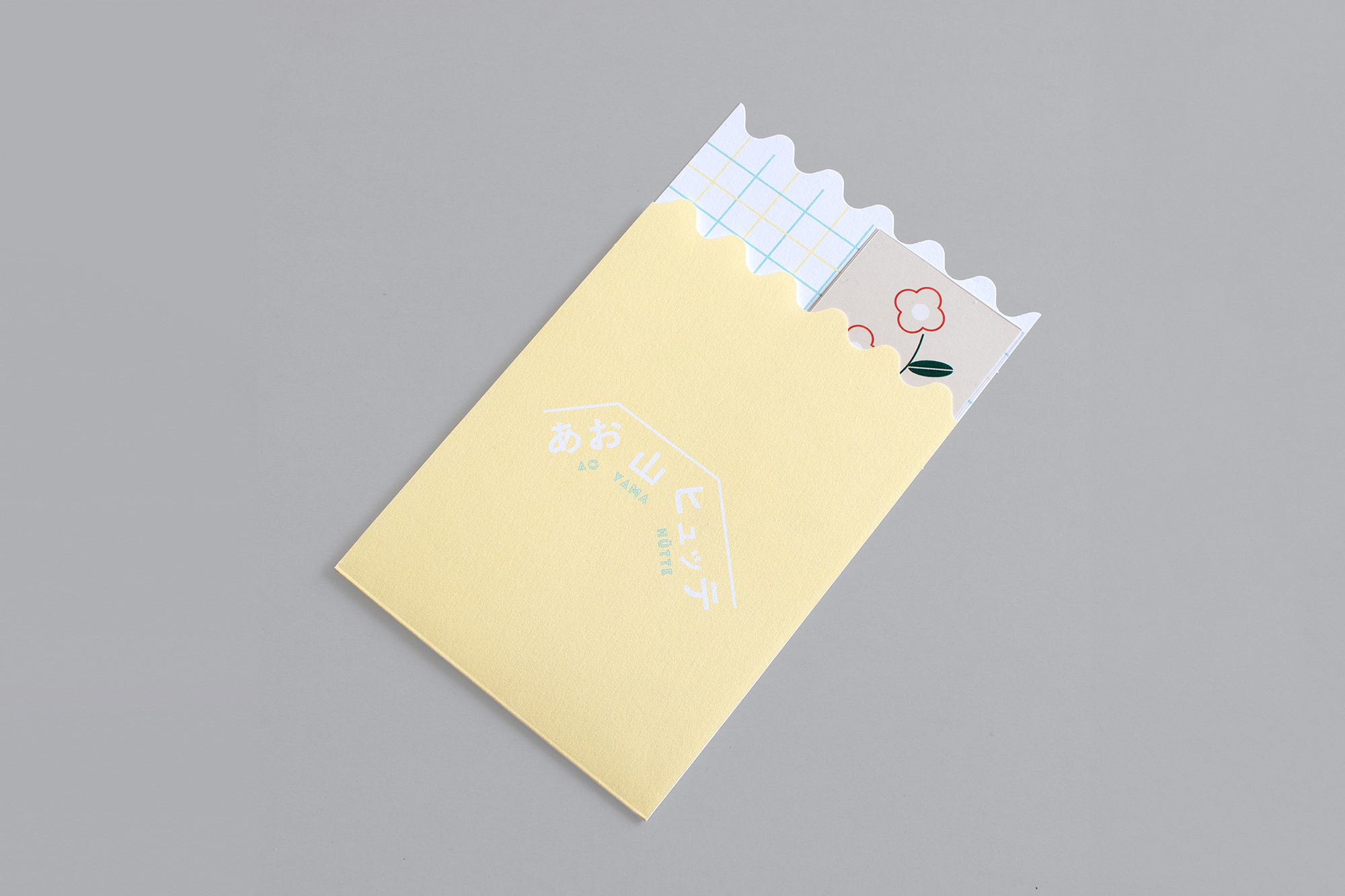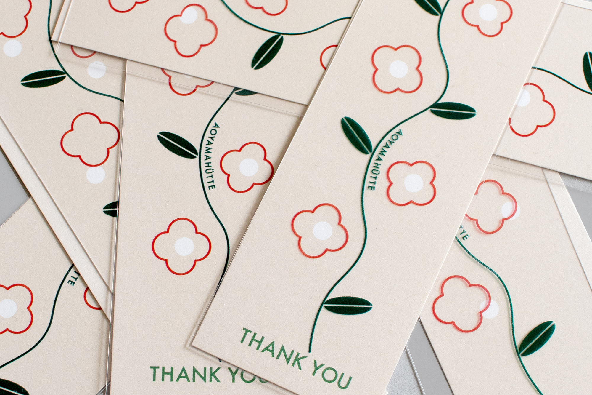 青山のてっぺんにある、あお山ヒュッテさんのお店の「THANK YOU CARD」をデザインさせていただきました。クリアカードと台紙の水玉カードを重ねることで、花の雰囲気が変わる仕様になっています。